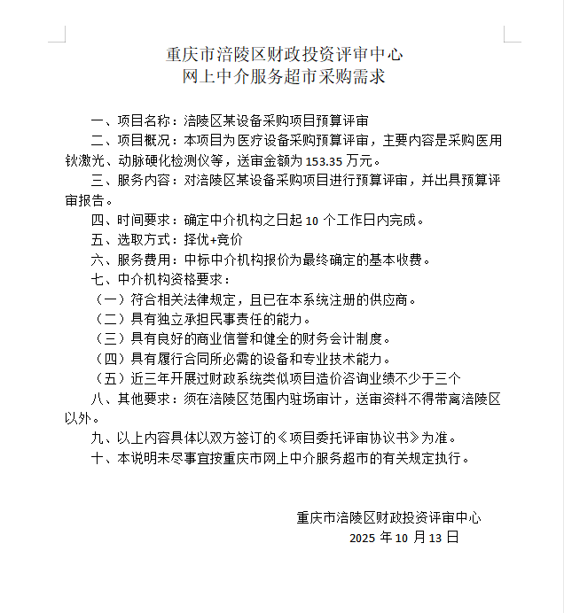 关于为【涪陵区某设备采购项目预算评审】 公开选取【工程造价咨询】机构的公告